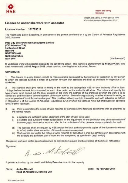 At every avenue, we aim to make our licencing certificate available for viewing, so you can be reassured that we are ready, prepared and most importantly approved for work with asbestos.